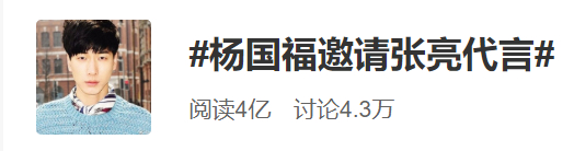 8月10日,话题#杨国福邀请张亮代言#冲上热搜榜,并且登顶榜首,目前阅读量已有4亿,讨论量达4.3万。