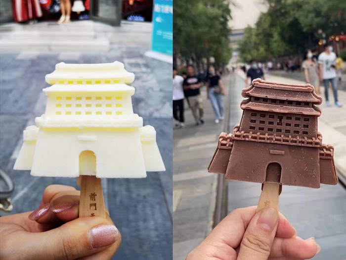 新京报记者发现,很多购买了“前门楼子”冰棍的消费者都举着冰棍与前门楼子合影,已成为前门大街上的一景。消费者贾小姐说,家里老人总会说“有钱,你买前门楼子去啊!”,“这回我真的就买了‘前门楼子’,还挺好吃。”贾小姐表示自己已经打卡过很多景点的冷饮,“比如故宫的石狮子、玉渊潭的樱花,虽然比普通冰棍要贵一点,但觉得有文化创意在里面。”