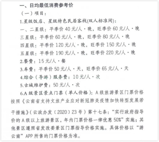 据介绍,日均最低消费参考价包括星级饭店、星级特色民居客栈(双人标准间)、餐费、车费、综合(导游)服务费、古城维护费以及A级景区景点门票(单人价格)。其中,五星级饭店的日均最低消费参考价,平季价为190元/人·晚,旺季价为220元/人·晚;车费平季价为50元/人·天,旺季价为65元/人·天。