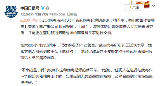 武汉病毒所所长驳新冠起源阴谋论:我们被当作替罪羊