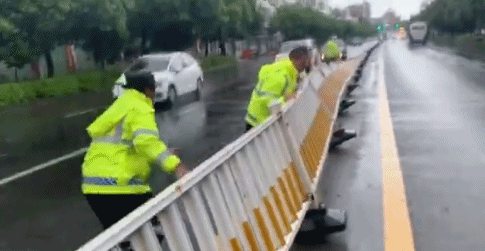在福建漳州,一处马路围栏被台风吹倒,消防人员合力扶起时,一名消防人员的脚被重重压住。