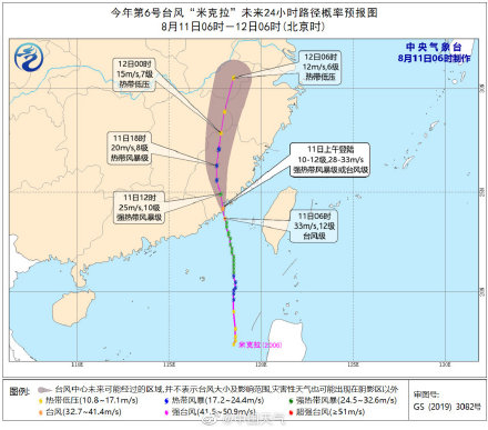 11日08时至12日08时,南海东北部和南部、巴士海峡、台湾海峡、台湾以东洋面、东海大部以及台湾岛沿海、福建沿海、浙江沿海将有6-7级大风,其中福建中南部沿海、台湾海峡南部将有8-10级大风,“米克拉”中心经过的附近海域或地区的风力有11-12级,阵风可达13-14级。