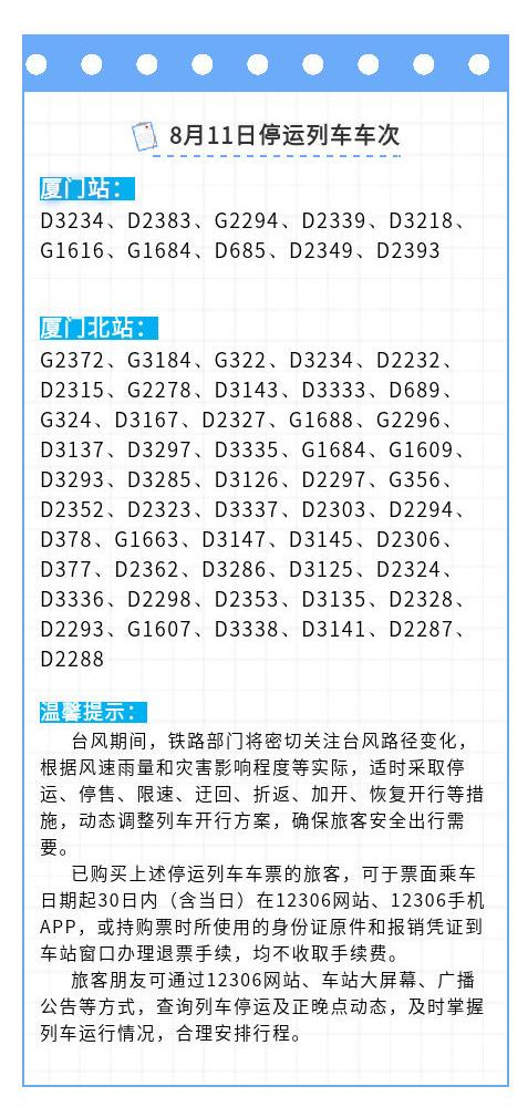 同时,厦门火车站、上海虹桥站部分车次也将停运。具体车次如下: