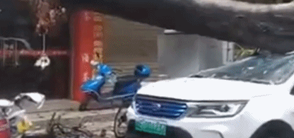 △漳州街头,一辆轿车被倒下的树木砸中。