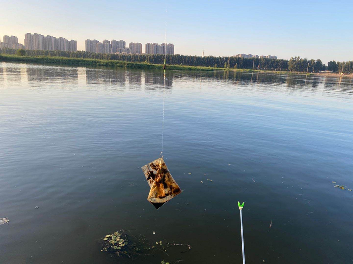 “嘿,老赵,你看我第一竿钓到什么?”野钓者吴先生举起鱼竿,鱼钩上挂着一个方便面的调料袋。