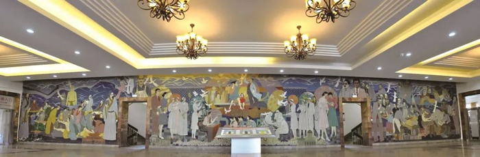 1984年的秋天,原白求恩医科大学新图书馆落成之时,时任馆长傅方浩教授在与年轻人交流时提出想在一楼大厅正面绘制一幅体现医学内涵的壁画,希望年轻人多提建议。当年还是刚刚参加工作23岁的于双成老师,脑海里瞬间浮现出一幅画面,随即向馆长建议是否可以这样:从左侧向中心展现中国医学的发展历程,从右侧向中心呈现西方医学的历史成就,中间是中西合璧托起我国的新医学。老馆长非常高兴,责成他具体推进。于是,于双成老师从当时预防医学院医学史教研室主任邢德刚教授那借来医学史教学幻灯片和教材,用投影仪为吉林艺术学院一群绘画专业的应届毕业生做了两次讲座,为壁画的创作提供了素材。他们在胡升高老师的带领下完成了壁画的设计与绘制。由于图书馆曾经发生过暖气管爆裂,大水严重损害了壁画,后经原白求恩医大绘图室同志作了局部修补,是为今天的模样。