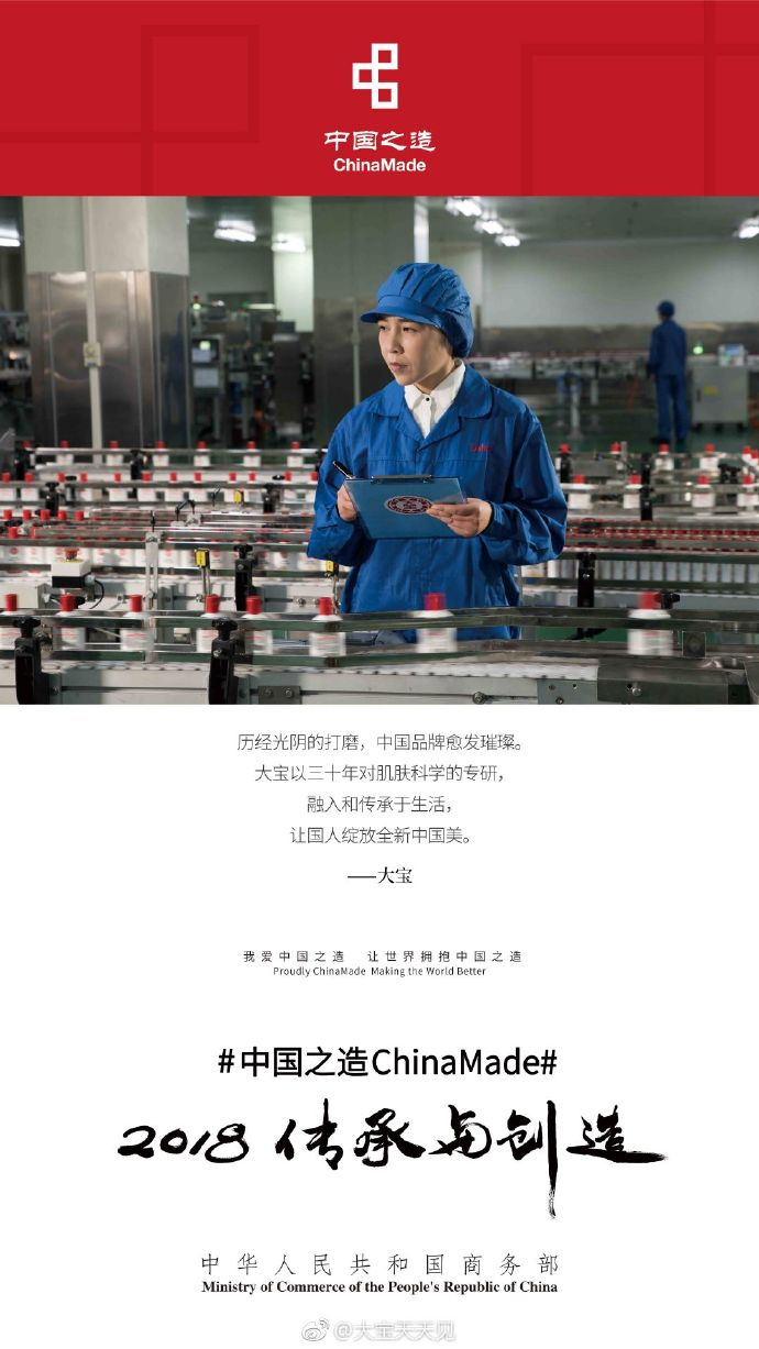 2018年,商务部启动“中国之造”品牌计划,作为“中国之造”品牌计划的唯一护肤品品牌,大宝受邀参与了此次宣传片的拍摄。“传承与创造”是这次主题公益宣传片的主题,也是大宝的故事。强生消费品中国区健康护肤事业部总经理王晨表示,“中国之造”包含三层含义,中国“制”造,中国“质”造,中国“智”造。而扎根于中国,解决中国人的护肤诉求就是大宝从品牌创立之初的使命。”