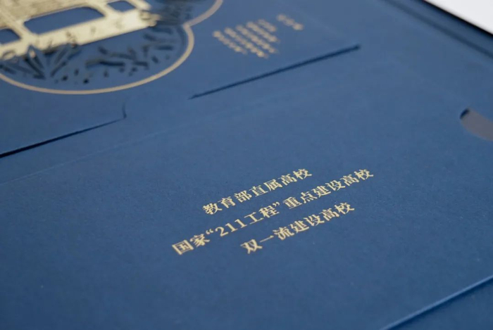 录取通知书全套由蓝色封套、纪念书签、愿景明信片、录取通知书和给新江南人的一封信组成。主体蓝色厚重沉稳,烫金镌刻校名校徽、2020录取通知书字样,蓝金相映,典雅精致;凹印北门和校训,突显江南第一学府之气质。