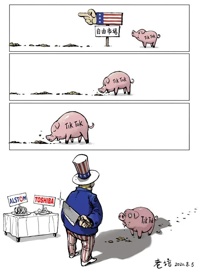 乐玉成:你的问题让我想到日前朋友圈里的一幅漫画:一条大路的入口处树着一个美国路牌,上面写着“自由市场”,一只可爱的“TikTok”小猪边走边吃,可待它长到膘肥体壮,走到尽头却发现山姆大叔正拿着一把刀准备屠宰它。这是目前在美中国企业处境的生动写照。
