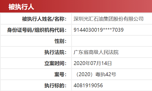 近日,新京报贝壳财经记者获悉,深圳光汇石油集团股份有限公司(下称“光汇集团”)被广东省高级人民法院列为被执行人,立案时间为7月14日,案号(2020)粤执42号,执行标的4081919056。