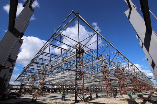 建设过程中,施工团队克服工期压力大、材料设备运输加工时间长等难题,科学组织、精准布局,历时40多个日夜,使用了2000余个螺栓球和8000多根杆件,按期完成了超大网架的拼接工作,保证了屋面网架整体实现顶升。