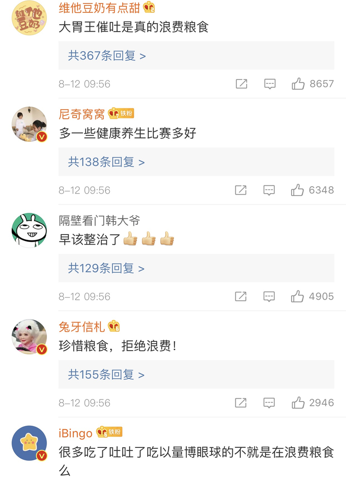 8月12日,央视新闻在一条《餐饮浪费 如何制止?》的新闻节目批评了部分网络大胃王吃播浪费严重的现象,引起广泛讨论。