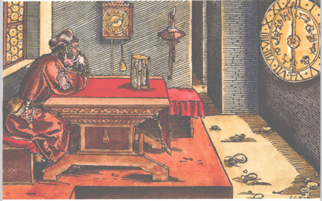 同样是描绘一段“懒惰”的时光,著名的人文主义者彼得拉克在1532年创作的版画《论浪费时间》却会给人截然不同的气质。照片中的大胡子男人手肘撑在桌子上,什么事也没干,但却盯着面前的一堆沙漏、钟表焦虑不已,仿佛在被时间催促着赶紧找到前进的目标。彼得拉克描绘的是一种独特的懒惰经验,在这种状态下,人其实并不敢真正懒散下来,而是始终盯着懒惰何时结束。罗兰·巴特也认为,有时出于对工作的厌烦,人们会进入一种消极的懒惰中,此时人们任由自己“分心”,怀着对工作的厌恶重复各种让自己注意力分散的事情。