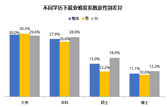 虽然学历越高的女大学生就业难度系数会更小,但女硕士的就业难度系数(18.9%)比男硕士(12.2%)高出6.7个百分点,在各类学历中表现出最大的性别差异。