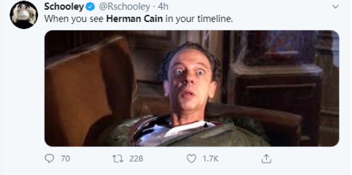 如下图所示,美国知名媒体人麦克摩尔就调侃说:在为了特朗普而牺牲了自己的生命后,赫尔曼·凯恩居然还在继续为特朗普发帖….