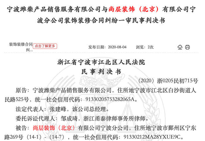 裁判文书网今年8月4日披露,浙江省宁波市江北区人民法院发布的(2020)浙0205民初715号民事判决书显示,原告宁波潍柴产品销售服务有限公司起诉尚层装饰的宁波分公司。