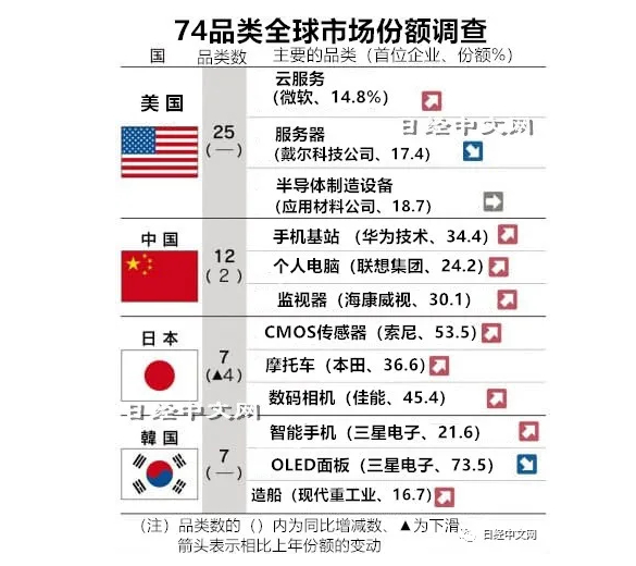 据日经新闻网13日报道,中国企业凭借旺盛的内需,正在世界高科技市场进一步提升存在感。日本经济新闻(中文版:日经中文网)发布的2019年“主要商品与服务份额调查”显示,中国在电子零部件等12个品类上获得最大份额,比上年多2个品类。反超日本,在各国和地区中排在第2位。