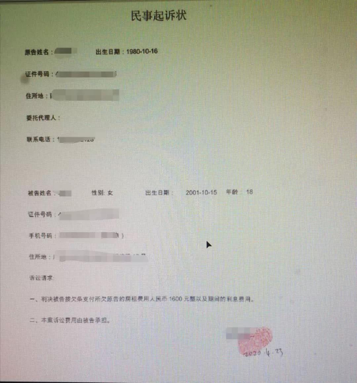 ▲原、被告地址只写到小区,要写到具体的门牌号;被告出生日期、公民身份号码未写。