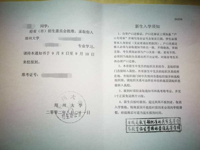 通知书的封袋正面印有郑州大学的标志性建筑——元和广场,同时还印有郑州大学校徽。随录取通知书一起寄出的还有:2016级新生入学须知、2016新生校园攻略、高等学校学生资助政策简介及贷款申请表、大学生应征入伍宣传单、校园手绘地图、郑州大学定制版手机卡。