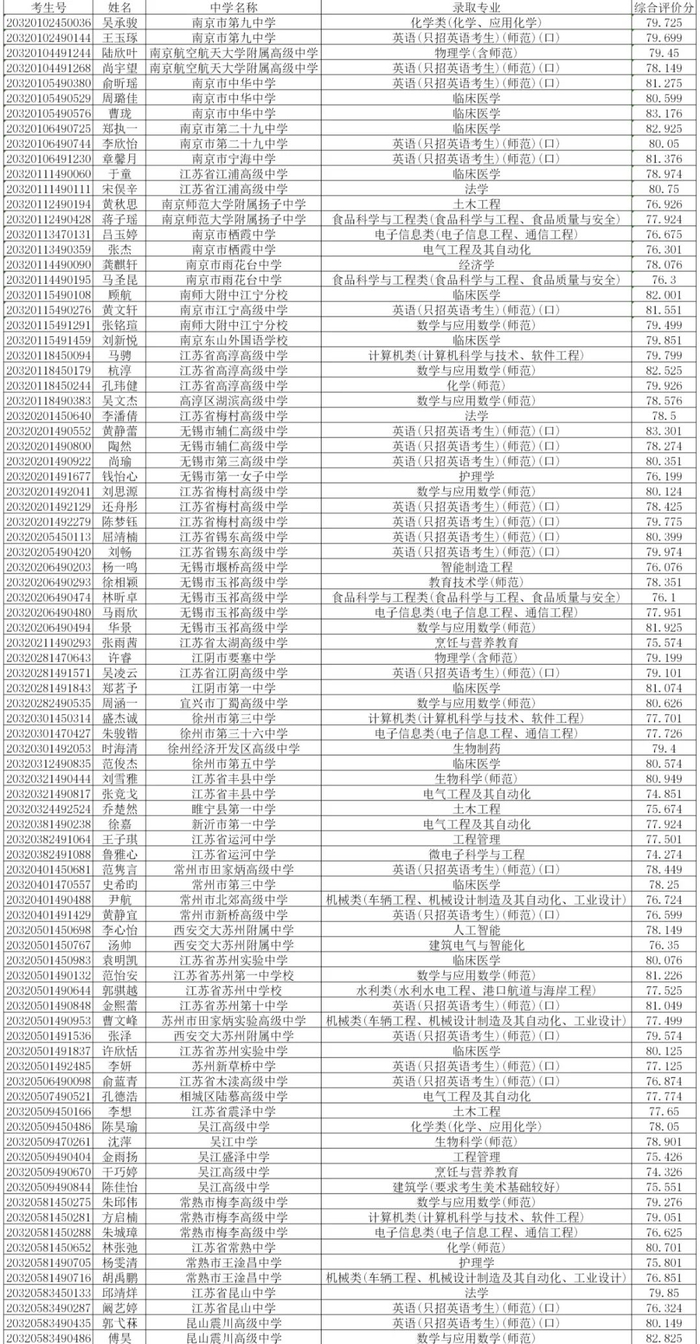 扬州大学2020年综合评价录取考生名单公示