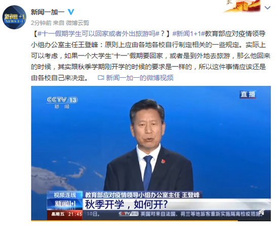 教育部应对疫情领导小组办公室主任王登峰:原则上应由各地各校自行制定相关的一些规定。实际上可以考虑,如果一个大学生“十一”假期要回家,或者是到外地去旅游,那么他回来的时候,其实跟秋季学期刚开学的时候的要求是一样的,所以这件事情应该还是由各校自己来决定。