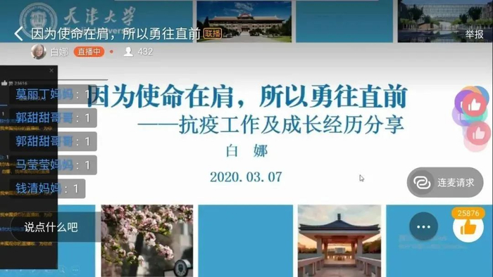 从邀请自己的同学好友到学生干部,从询问自己的导师教授到校团委助力邀请名师校友,云课堂师资库与课程库的水平在不断提高。现如今,云课堂师资库中已经包含了天津大学名师大家和专业教师,辅导员和思政课教师,杰出校友和企业导师,自强之星、十佳杰出青年、学生科学奖获得者等优秀青年学子。让教师用科学精神和家国情怀引领学生,让青年朋辈用青春故事和奋斗足迹感染学生。云课堂将广泛走进天津大学研究生支教团服务地的中小学课堂,真正实现“不走的支教”目标。