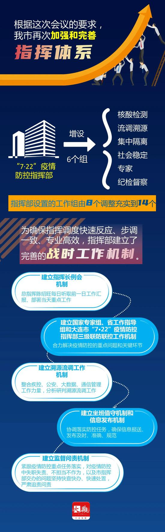 省委常委、市委书记谭作钧多次作出指示批示,深入抗疫一线,听取专家意见,并多次主持召开市委常委会和市总指挥部会议,领导全市疫情防控工作。7月23日,大连市统筹推进疫情防控和经济社会发展工作指挥部会议决定,升级“‘7·22’疫情防控专班”为“‘7·22’疫情防控指挥部”,市委副书记、市长陈绍旺任总指挥,市委副书记徐少达,市委常委、副市长骆东升任常务副总指挥,副市长张志宏、温雪琼、杨耀威任副总指挥,战时指挥力量全面加强。