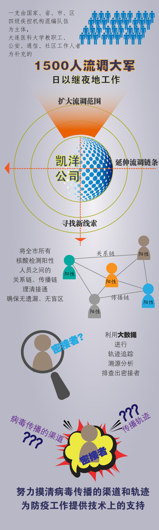 疫情发生后,流调溯源,刻不容缓。坚持“全、快、准、严”标准,我市通过科学专业的个案流调、大数据比对和基因测序,确定本次疫情为同一个传播链,排除了与近期国内其他地区局部聚集性疫情的关联性。这个结论进一步支持了我市以凯洋公司及其所在地为重心的疫情防控策略。以密切接触者管理为重点划大“包围圈”。一支由国家、省、市、区四级疾控机构混编队伍为主体,大连医科大学教职工、公安、通信、社区工作人者为补充的1500人的流调大军日以继夜地工作。
