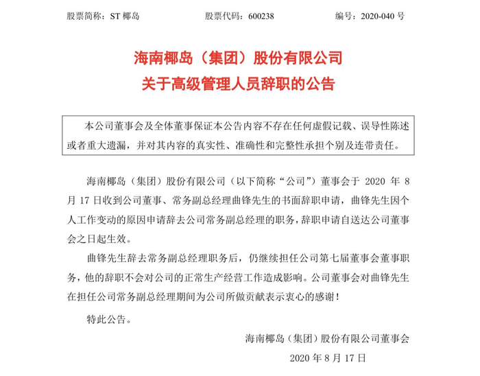 原标题:高管团队再现变动,ST椰岛常务副总经理曲锋宣布辞职