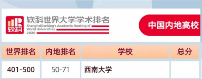 原标题:重磅 | 2020软科世界大学学术排名发布:西南大学首次跻身500强