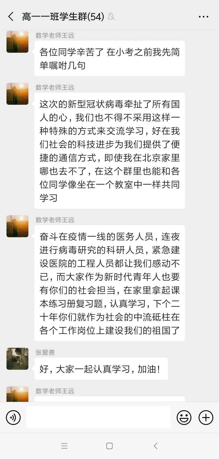 在教学之余,王远主动了解学生们的心理状况。让他欣慰的是,这群孩子比他想象的要坚强许多。“奋斗在一线的医务人员,连夜进行病毒研究的科研人员,紧急建设医院的工程人员都让我们感动不已。大家作为新时代的青年人也要有你们的社会担当,在家里拿起课本认真学习,下个二十年就是你们作为社会的中流砥柱、在各个岗位上建设我们的祖国了。”王远觉得时机恰好,在一次测验开始之前他这样对学生们说。