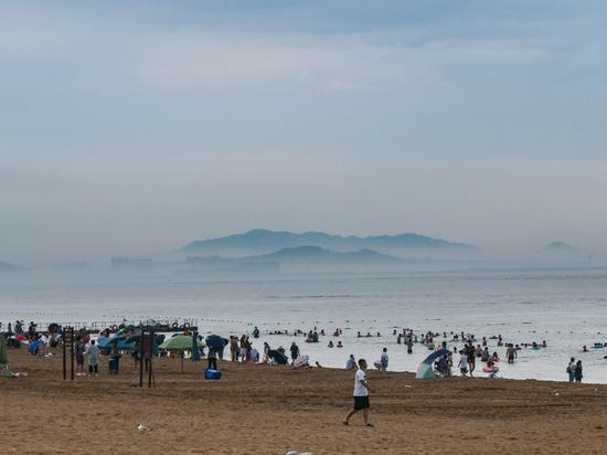 8月15日,秦皇岛昌黎县黄金海岸景区海边出现海市蜃楼景观,远远的海面上突然出现了绵延的群山,场面甚为壮观,人们纷纷用手机和相机记录下这罕见的一幕。