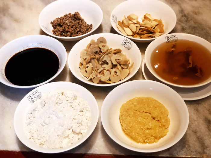 用腌制过的面筋切成小块替代猪大肠,用片成片儿的豆干替代猪肝,再用香菇、松茸提鲜增香⋯⋯郑建华做出的“素炒肝儿”与传统的炒肝儿放在一起,几乎以“素”乱“荤”。“保留了传统炒肝儿红亮的芡汁颜色,尤其是炒肝儿‘宝盏含晶’的形态,一点儿不输。面筋、豆干吃起来,也接近猪肠、猪肝的口感。”郑建华说,素炒肝儿推出以来,每月大概可以售出三四千碗,“老顾客都觉得挺不错,尤其配上‘手托碗底,转着碗边喝’的传统姿势,都觉得味儿正、解馋。”