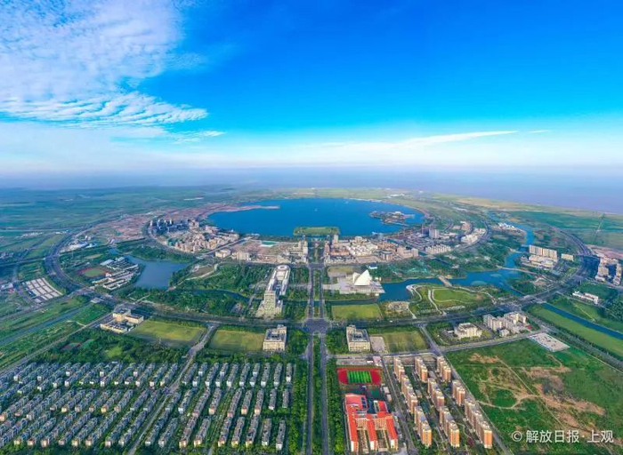 8月13日,申城再现碧云天,上海临港新片区在水晶天的映衬下美不胜收。