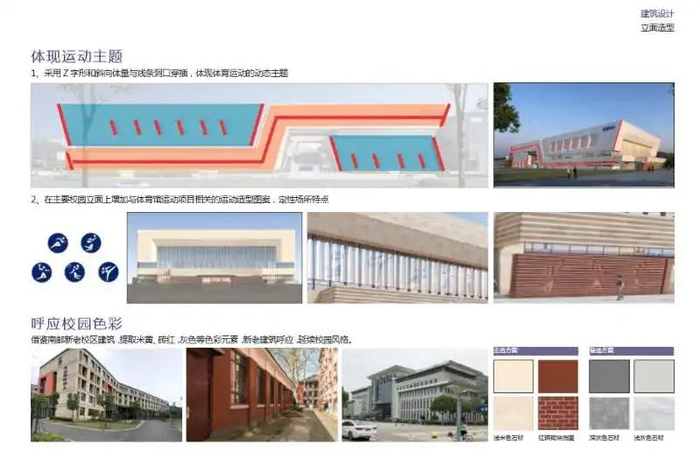 5.造型设计:设计用简洁灵动的设计语言,利用形体的错动和材料的变换,在方整大气的整体形态下,形成灵活的立面表情,展现了活力四射的校园形象。