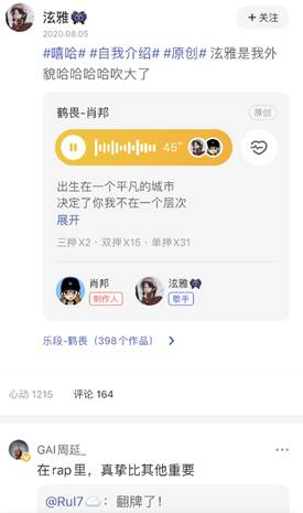 8月17日晚,《中国新说唱》厂牌主理人GAI周延空降唱鸭APP,邀请网友用Rap进行自我介绍。当晚,GAI为粉丝在线“批作业”,还暖心鼓励唱鸭网友:在Rap里,真挚比其他重要。