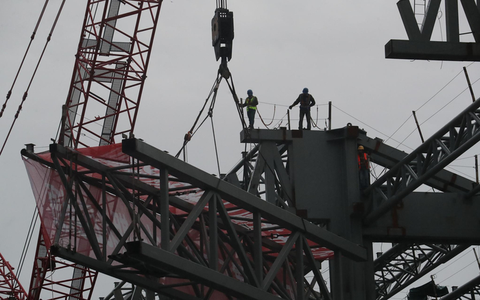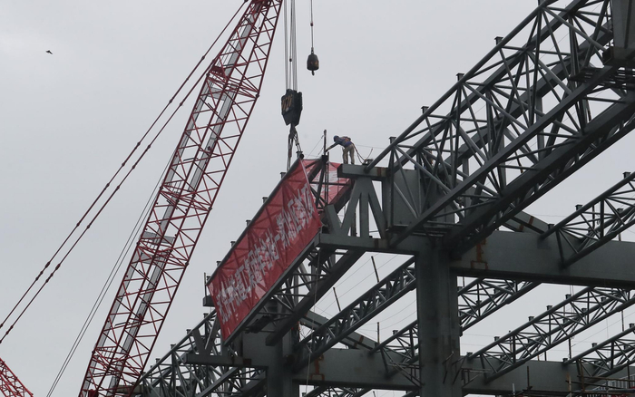 大型机械开始起吊长20米、重约15吨的最后一根钢梁。摄影/新京报记者 王贵彬