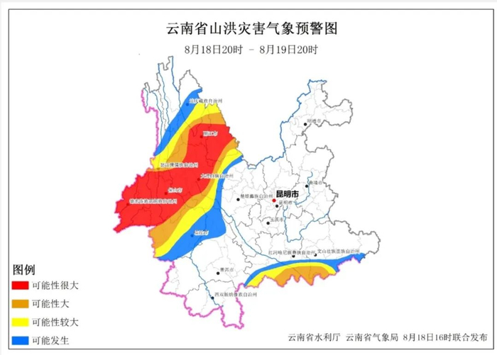 同时间段内,预计金沙江流域迪庆州南部、丽江市大部、大理州大部,红河流域大理州、红河州南部、文山州西南部,澜沧江流域大理州、怒江州南部、保山市、临沧市北部,怒江流域怒江州南部、保山市、德宏州、临沧市西部,伊洛瓦底江保山市、德宏州发生山洪灾害可能性大(Ⅱ级)。