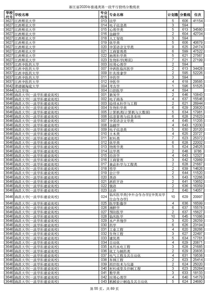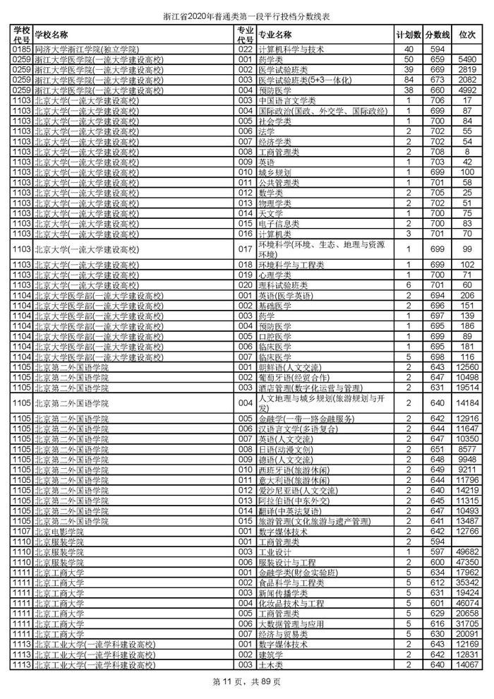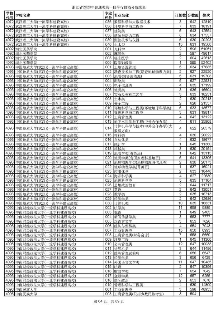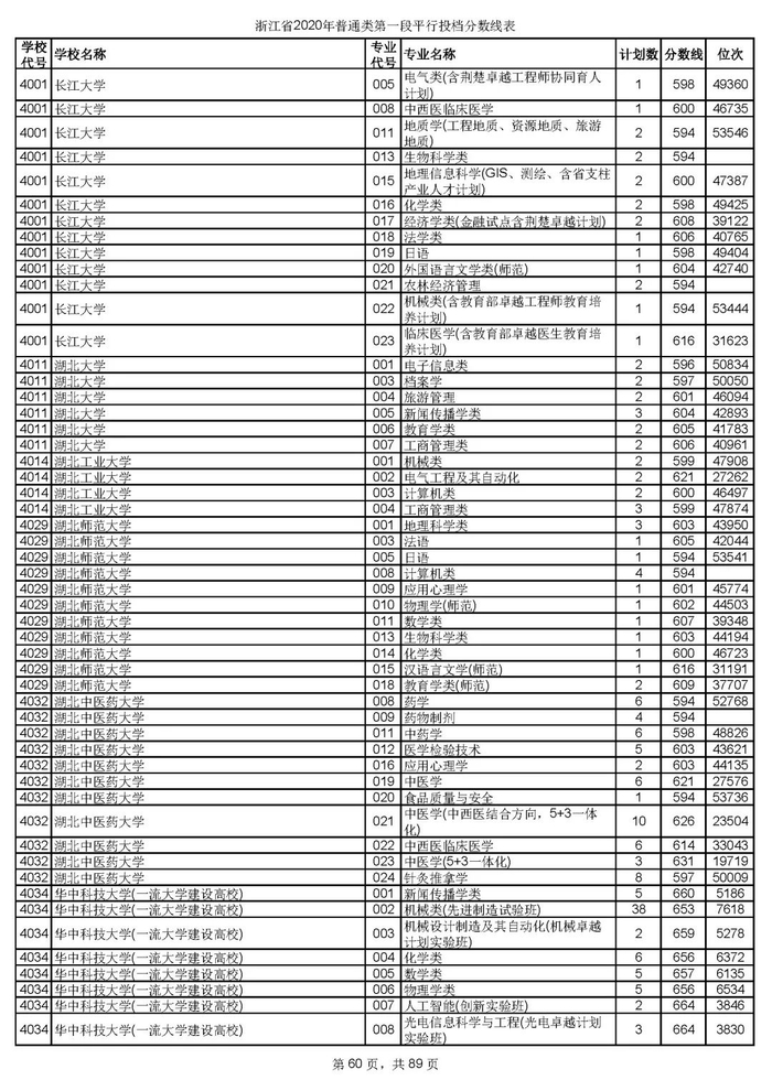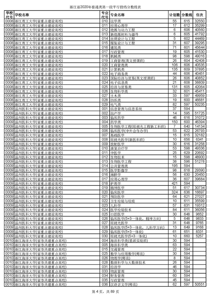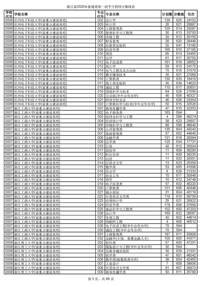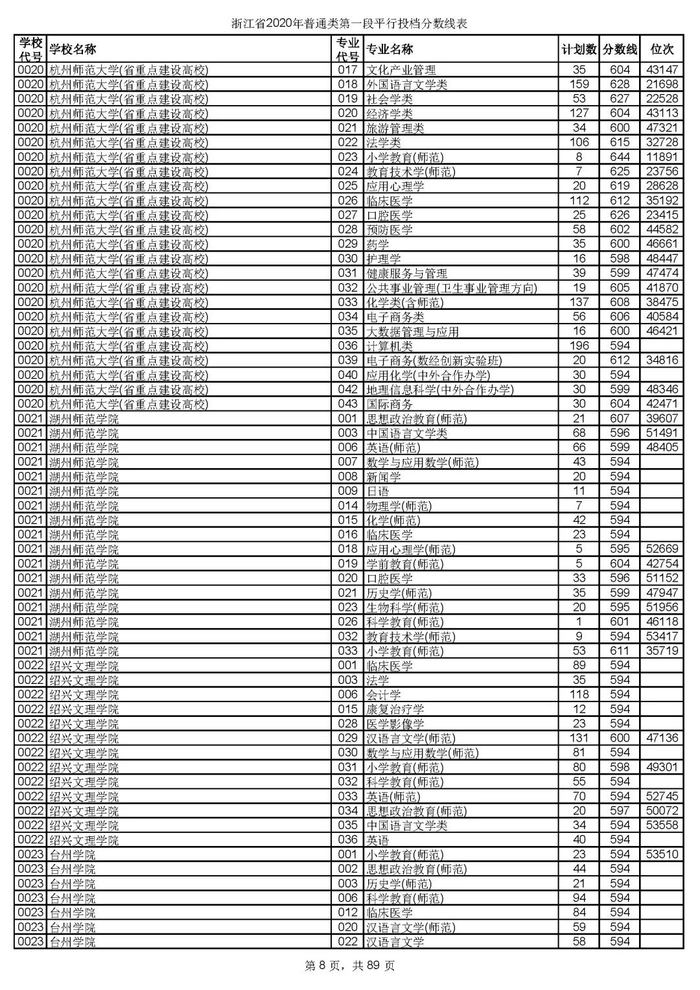 浙江省2020年普通类第一段平行投档分数线