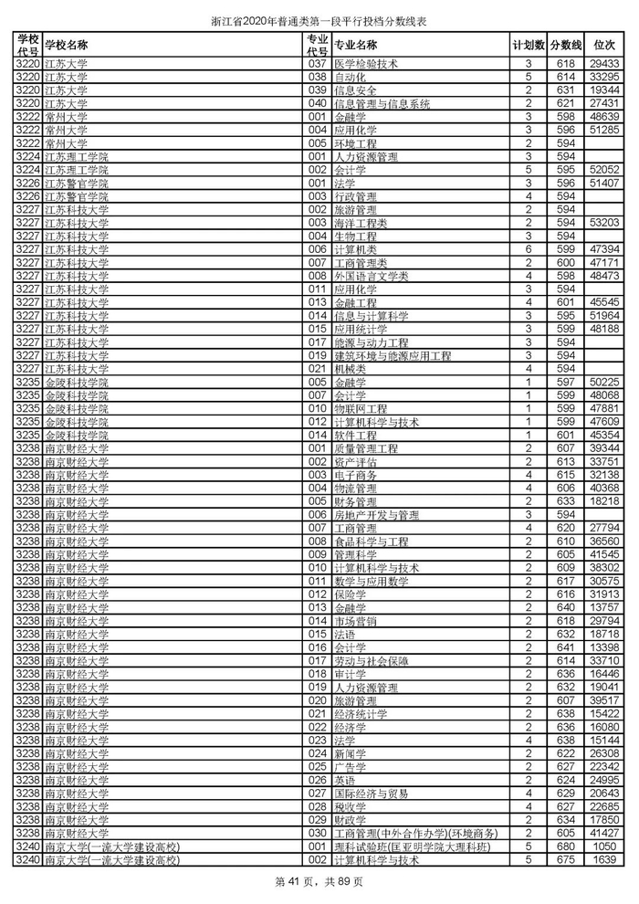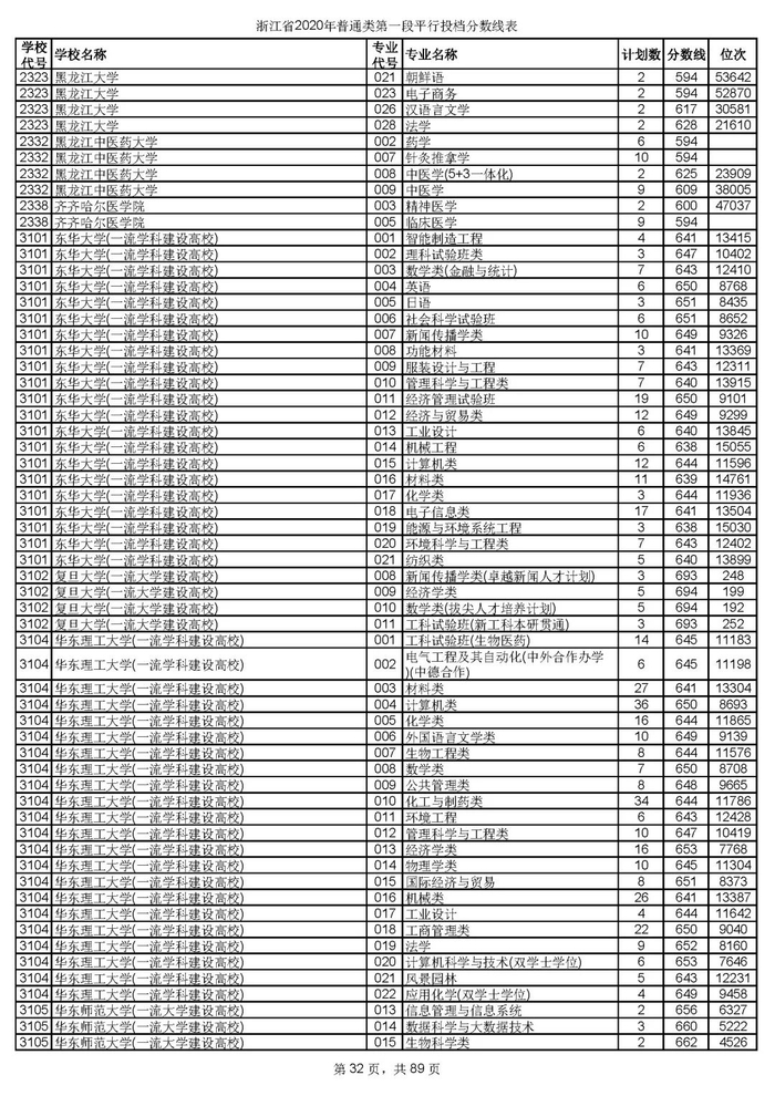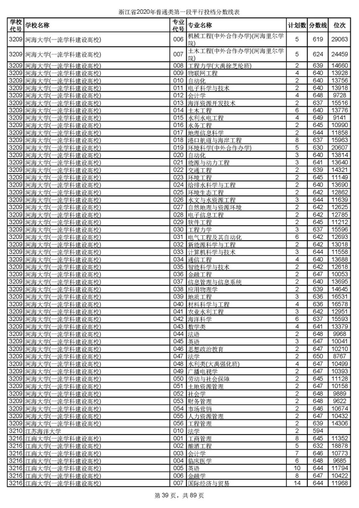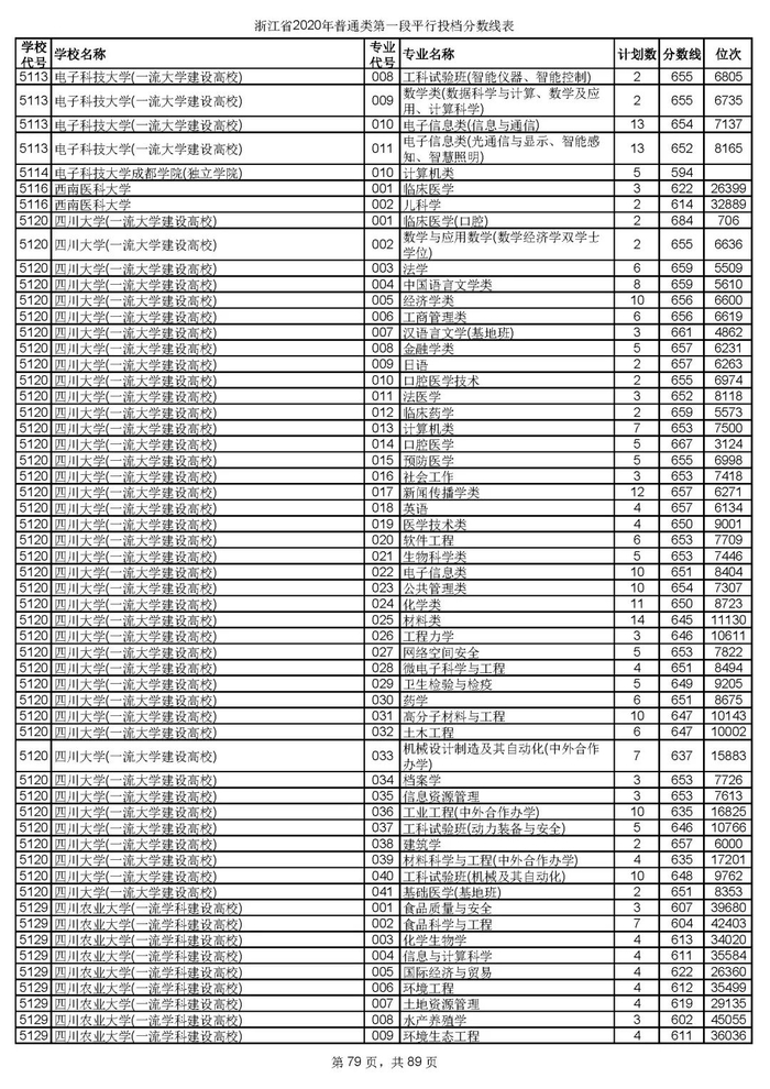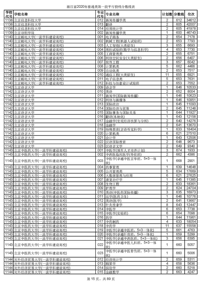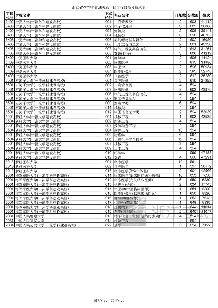 浙江省2020年普通类第一段平行投档分数线