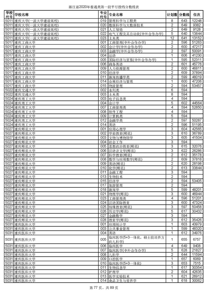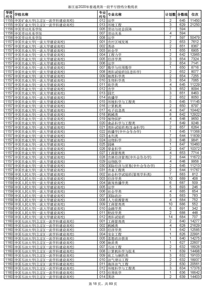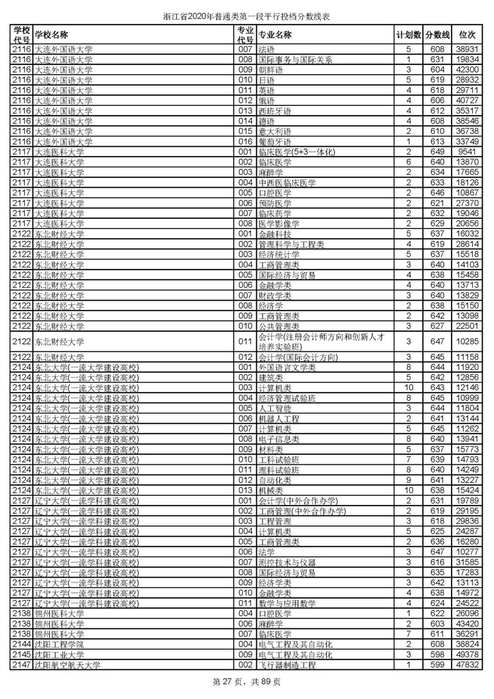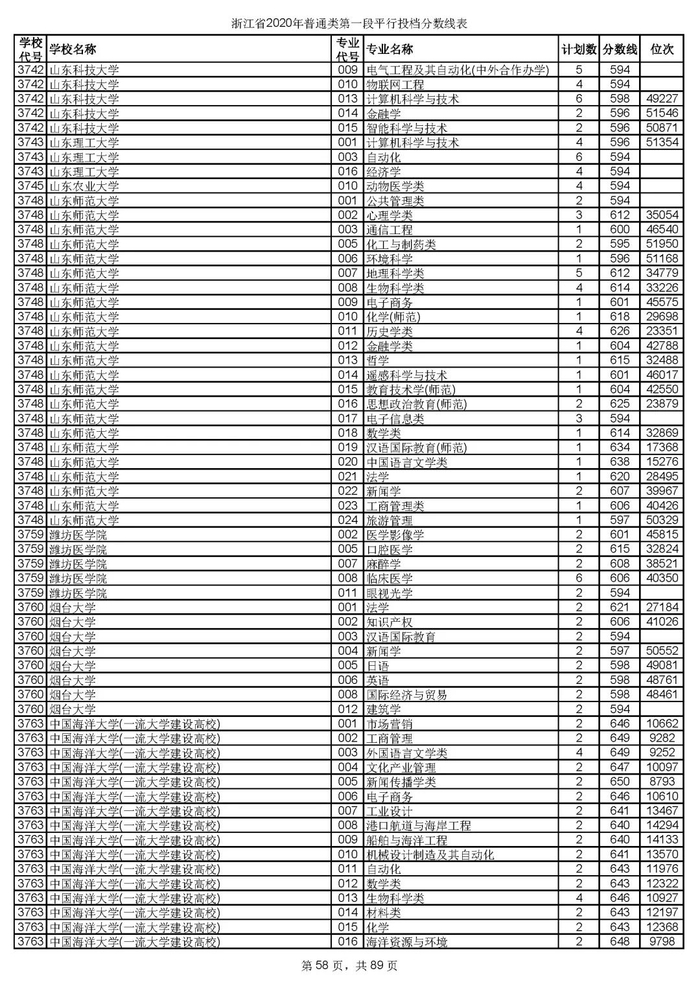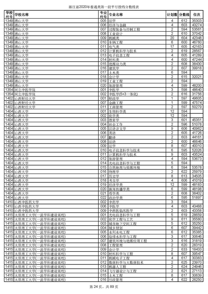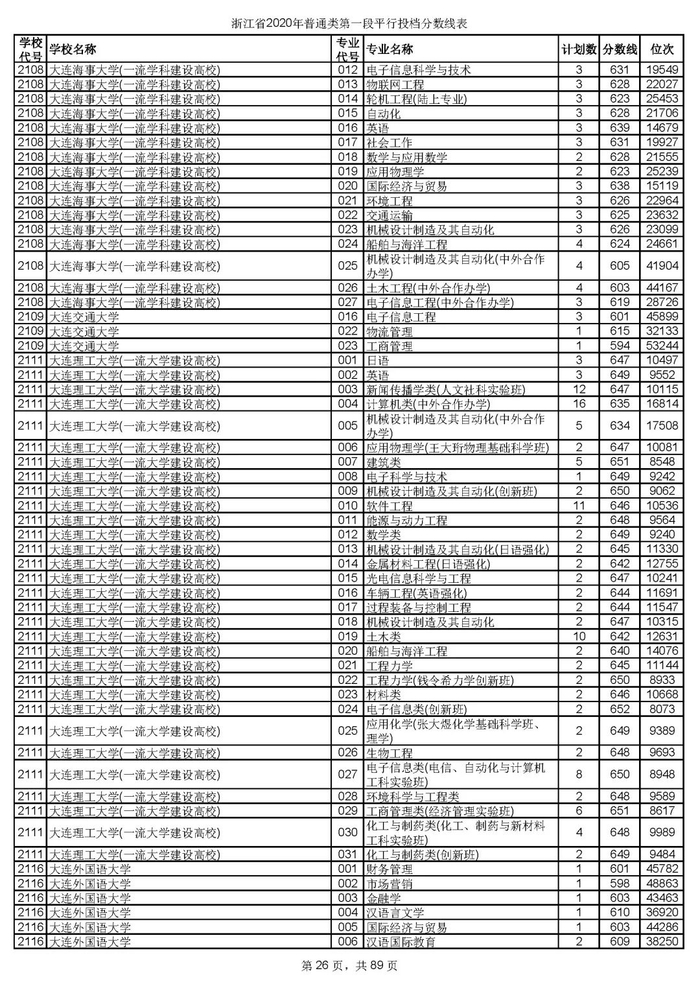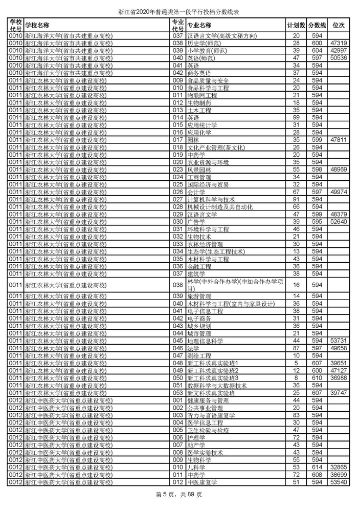 浙江省2020年普通类第一段平行投档分数线