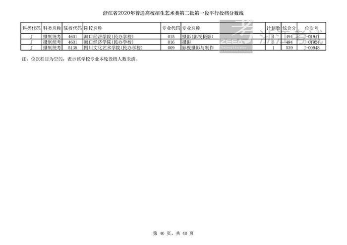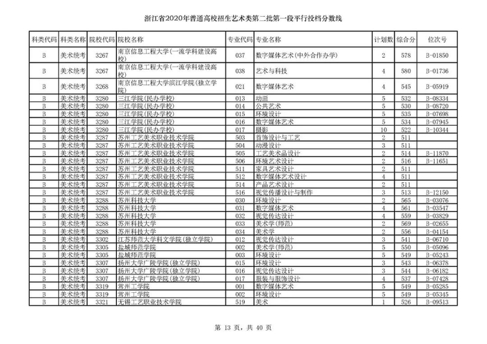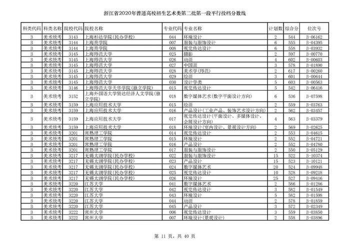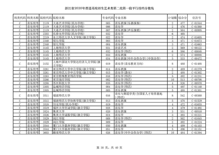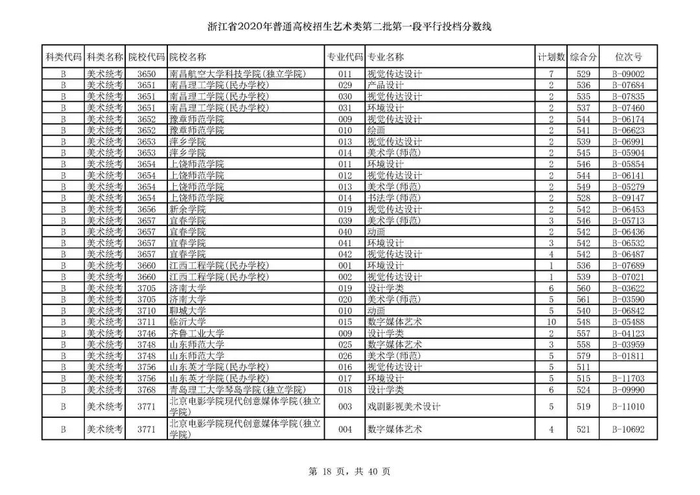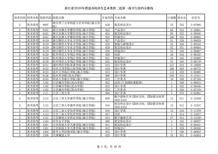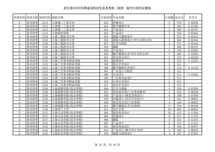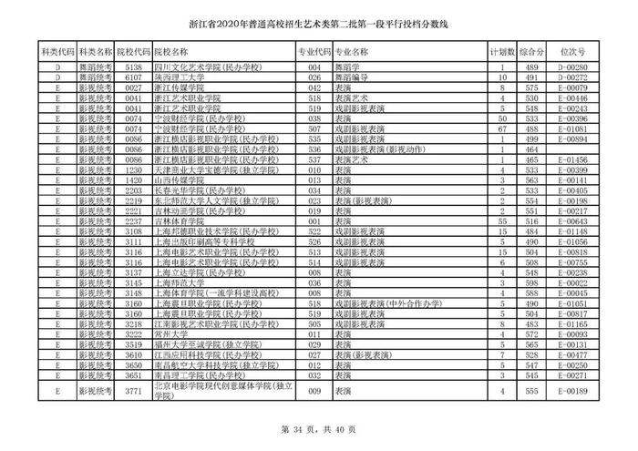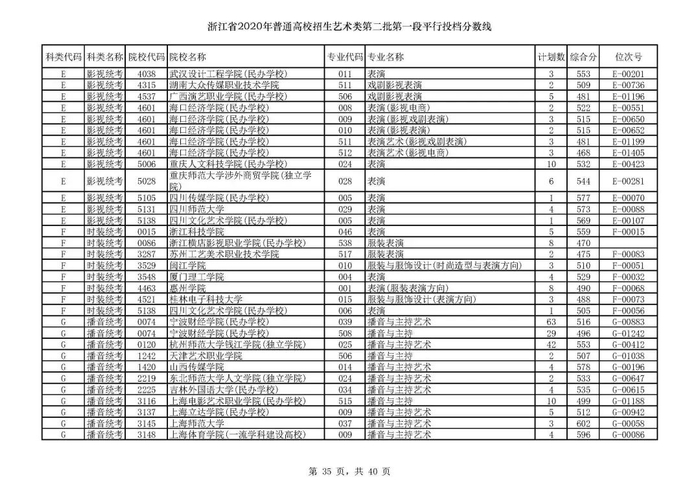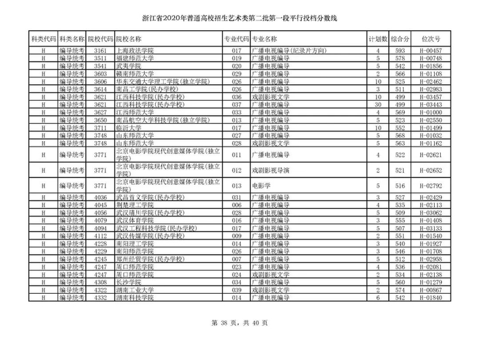 浙江省2020年艺术类第二批第一段平行投档分数线
