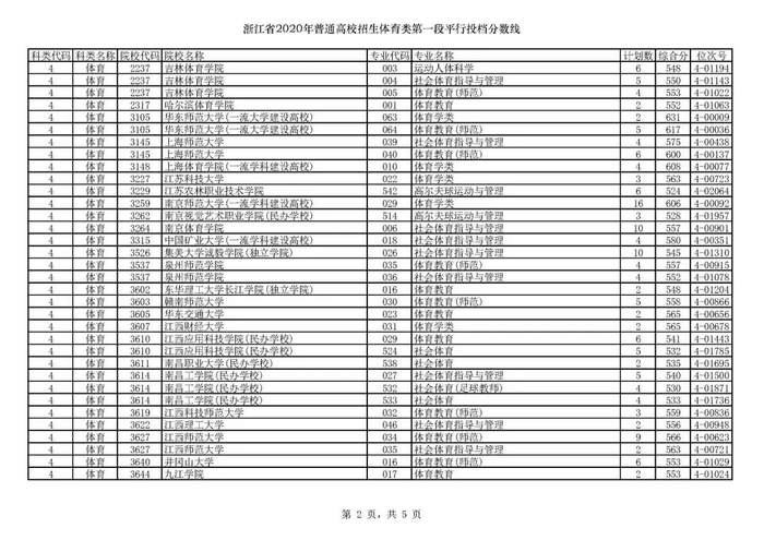 浙江省2020年体育类第一段平行投档分数线