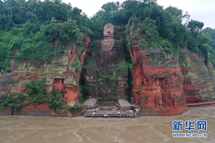8月19日,随着洪水减退,乐山大佛的脚趾已重新露出水面,水位退至佛脚平台以下,一江之隔的凤洲岛水位也已退下。新华网发(李昕锋 摄)