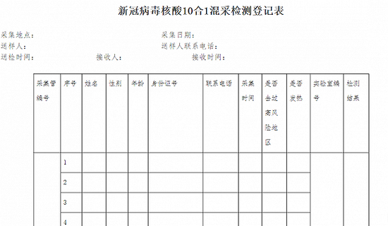2。登记要求。推荐使用身份证读卡器、二维码条码等信息化手段关联受检者信息,提高信息读取效率和准确性。如不具备信息化条件,应当提前登记《新冠病毒核酸10合1混采检测登记表》(见附件,以下简称混采登记表)。纸质登记表随标本送检前应当备份存档于采集点所在社区,便于及时追溯受检者。