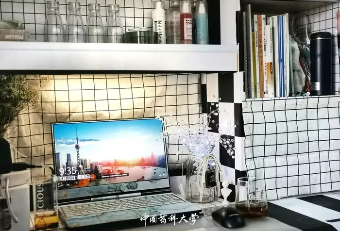 课间休息片刻,放松一下自己,去看看教室外的风景是一个不错的选择。抬头便是湛蓝的天空,朵朵白云自由飘荡,尽情舒展;低头览药大美景,阳光明媚,花开正好,俯仰之间,景色尽收眼底。