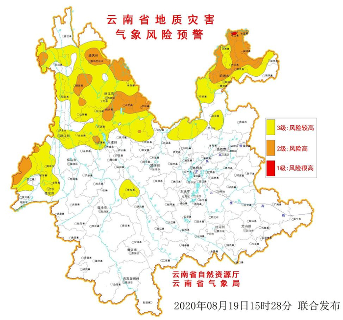 气象部门提醒,近期云南降雨不断,累积雨量大、持续时间长,导致土壤饱和,再加上地质灾害的发生有一定的滞后性,公众仍不能放松对地质灾害的防御。预计8月19日20:00—20日20:00,昭通部分地区发生滑坡泥石流等地质灾害的风险很高(红色预警);昭通,怒江、迪庆、丽江、大理,德宏、保山部分地区发生滑坡泥石流等地质灾害的风险高(橙色预警); 昭通、曲靖,怒江、迪庆、丽江、大理,德宏、保山,普洱,楚雄及昆明部分地区发生滑坡泥石流等地质灾害的风险较高(黄色预警)。