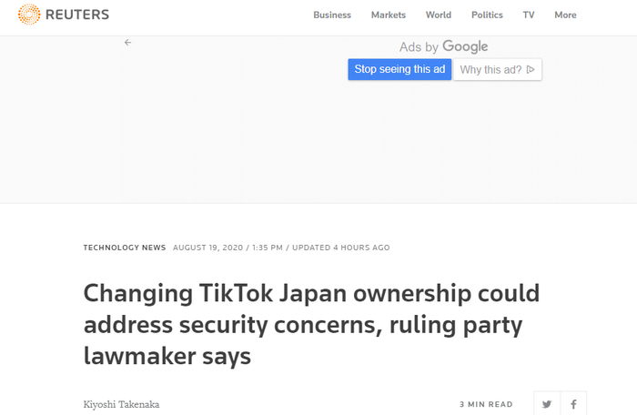 随后,他还“提议”称,字节跳动可以将TikTok在日本当地的业务所有权进行变更,以此“解决日本用户在数据安全方面的担忧”。