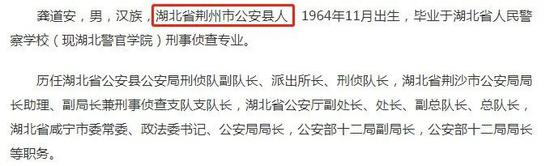 公开资料显示,现年56岁的龚道安,从毕业后就进入公安系统工作,至被调查前,已经在公安系统工作39年。