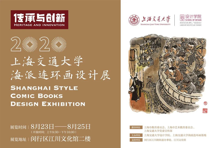 2020年8月23日到25日,由上海市教育委员会、上海市艺术教育委员会、上海交通大学党委宣传部指导,上海交通大学设计学院海派连环画传承基地(上海市高校中华优秀传统文化传承基地)承办的“传承与创新:海派连环画设计展”将在上海闵行区鹤庆路366号江川路文化馆举办。